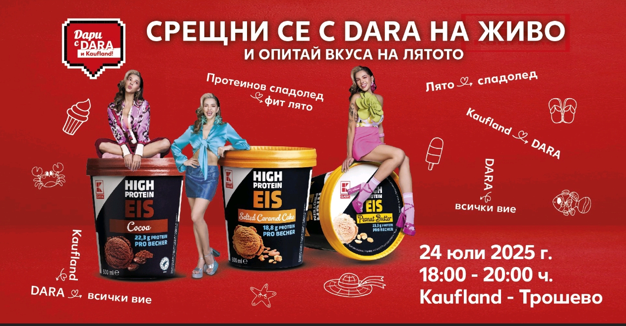Летните емоции във Варна ще станат още по-сладки на 24 юли, когато поп идолът DARA ще се срещне лично с феновете си в хипермаркета на Kaufland в кв. „Трошево“. Срещата ще започне в 18:00 ч. и ще продължи до 20:00 ч., като всеки почитател ще има възможност за снимка, автограф и кратък личен момент с изпълнителката. По време на срещата петима ще могат да спечелят и двойни билети за концерта на изпълнителката във Варна на 20 август.