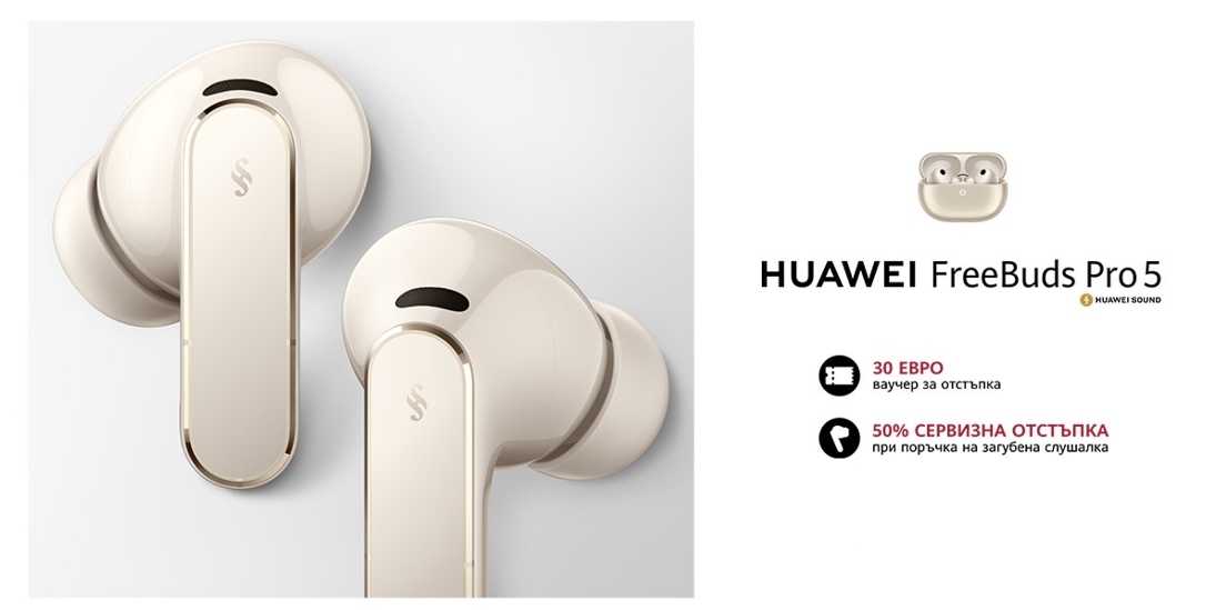 Днес Huawei официално представи HUAWEI FreeBuds Pro 5 – първите в света слушалки с двуядрено шумопотискане, по време на HUAWEI Innovative Product Launch в Мадрид, Испания. Новите флагмански слушалки осигуряват аудио изживяване без загуба на качество и значително подобрено шумопотискане. Моделът предефинира потребителското изживяване при слушане на музика, провеждане на разговори и ежедневна продуктивност, като поставя нов стандарт при True-Wireless-Stereo (TWS) устройствата. За радост на българските потребители HUAWEI FreeBuds Pro 5 са вече в продажба у нас в Tехнополис,  А1, Yettel, Vivacom, верига магазини Зора и партньорската мрежа на дистрибутора Поликомп, която включва – Ozone.bg, Ardes.bg, PLESIO, Laptop.bg, на цена от 199 евро с 30 евро ваучер за отстъпка до 31 март. До една година от датата на закупуване, потребителите могат да се възползват от 50% сервизна отстъпка при загубена слушалка. Моделът се очаква скоро и в Техномаркет.
