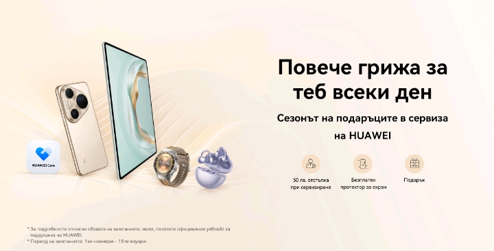 Повече информация и пълните условия на кампанията може да намерите тук: https://consumer.huawei.com/bg/support/service-giving-season-2025/.