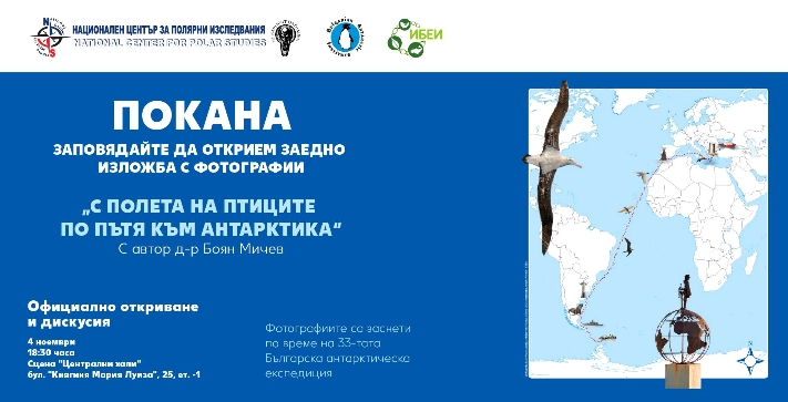 На 4 ноември от 18:30 ч. Сцена Централни Хали ще се превърне в отправна точка на едно необикновено пътешествие от бреговете на Варна, през далечните Южни Шетландски острови до прага на Антарктика. Изложбата „С полета на птиците по пътя до Антарктика“ на д-р Боян Минчев, главен асистент в Института по биоразнообразие и екосистемни изследвания към БАН и специалист по орнитология, разкрива магията на южните ширини през своя обектив като участник в 33-ата Българска антарктическа експедиция. Събитието е с вход свободен.
