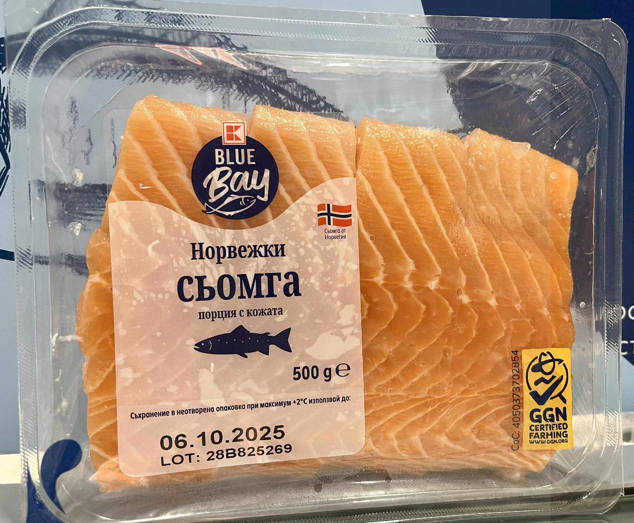 Нова серия пакетирана свежа риба добави към асортимента си една от най-големите вериги у нас – Kaufland България. 3 вида сьомга и свежи мариновани скариди под собствената марка K- Blue Bay вече могат да бъдат намерени във всички магазини в цялата страна. Трите вида сьомга – филе нарязано на 4 порции по 125гр, с пипер и с билки, както и морските дарове, са носители на международните сертификати GGN и ASC, които гарантират безопасност на храните, опазване на околната среда и хуманно отношение към животните.