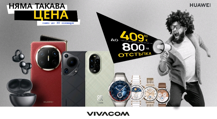 Vivacom стартира атрактивна ноемврийска кампания с отстъпки до 409.03 € | 800 лева на селектирани устройства на Huawei. В промоцията влизат смартфони и смартаксесоари на бранда – включително сгъваемия Huawei Mate X6, серията Pura 70, една от най-продаваните серии часовници – Watch GT5, и FreeClip слушалките с иновативен дизайн. Офертите са валидни в комбинация с мобилен план Unlimited MAX, който осигурява неограничени мегабайти и минути в 5G мрежа с най-голямо покритие в България[1].