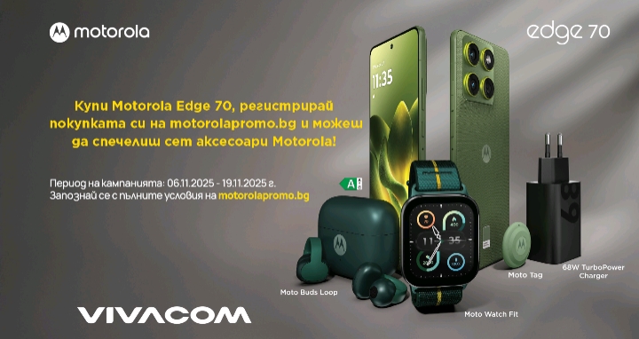 Vivacom стартира продажбите на най-новия модел в премиум серията на Motorola – Edge 70 който впечатлява с дизайн, производителност и издръжливост. Смартфонът вече е наличен в търговските обекти на телекома, както и онлайн на vivacom.bg. Всеки клиент, който закупи Motorola Edge 70 може да получи комплект аксесоари Motorola, като регистрира покупката си на motorolapromo.bg от 6 до 19 ноември или до изчерпване на наградите.